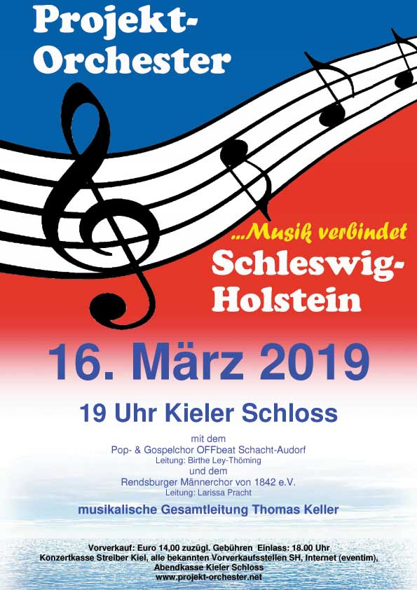 Das nächste Konzert findet am 16.03.2019 um 19:00 Uhr im Kieler Schloss statt. Zu diesem Konzert haben wir uns Gäste eingeladen. Ein großer gemischter Chor aus Rendsburg mit 120 Sängern wird uns unterstützen. Unser Credo „Musik verbindet“ funktioniert nunmehr zum 8. Mal. Die Mitwirkung in unserem Orchester ist für die Musiker kostenlos und in dieser Konstellation in SH und bundesweit einmalig. Ich leite dieses Orchester seit 8 Jahren ehrenamtlich. Wir würden uns freuen, wenn wir dieses Orchester unserem Bundesland einmal vorstellen dürften.