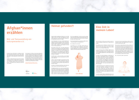 Das Team von kulturgrenzenlos e. V. präsentiert innerhalb der Fläche eine Bild- und Textausstellung. Die Ausstellung wird trotz Lockdown vor Ort aufgebaut und die Inhalte so digitalisiert, dass sich Interessierte in einer digitalen 360 Grad-Ansicht durch die Ausstellung navigieren können. Unter www.kulturgrenzenlos.de/afghaninnen-erzaehlen sind die Bilder und Texte dann nicht nur zu sehen, sondern letzteres auch zu hören, denn die Inhalte wurden entsprechend vertont.