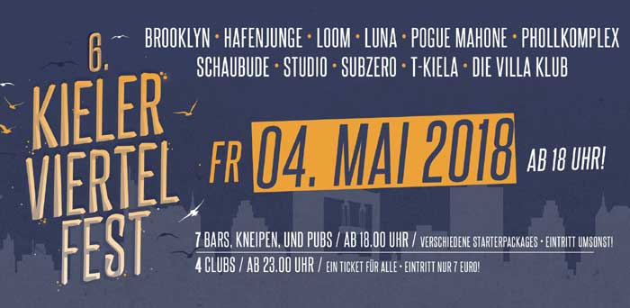 30515880_158514218162933_54(CIS-intern) – BROOKLYN, HAFENJUNGE, LOOM, LUNA, POGUE MAHONE, PHOLLKOMPLE X, SCHAUBUDE, STUDIO, SUBZERO, T-KIELA und DIE VILLA KLUB laden ein zum 6. KIELER-VIERTEL-FEST am Freitag, 04. Mai 2018 – ab 18 Uhr! 7 Bars, Kneipen, und Pubs ab 18.00 UhrVerschiedene Starterpackages bis 23.00 Uhr – Eintritt umsonst!